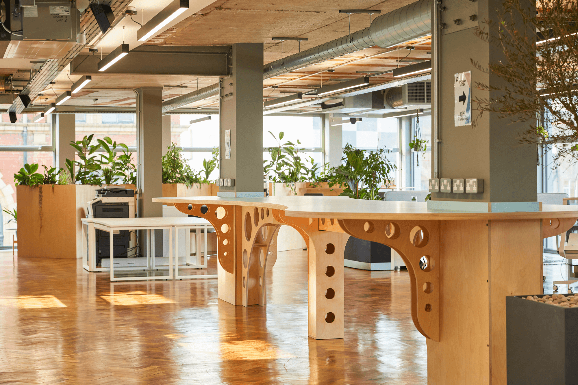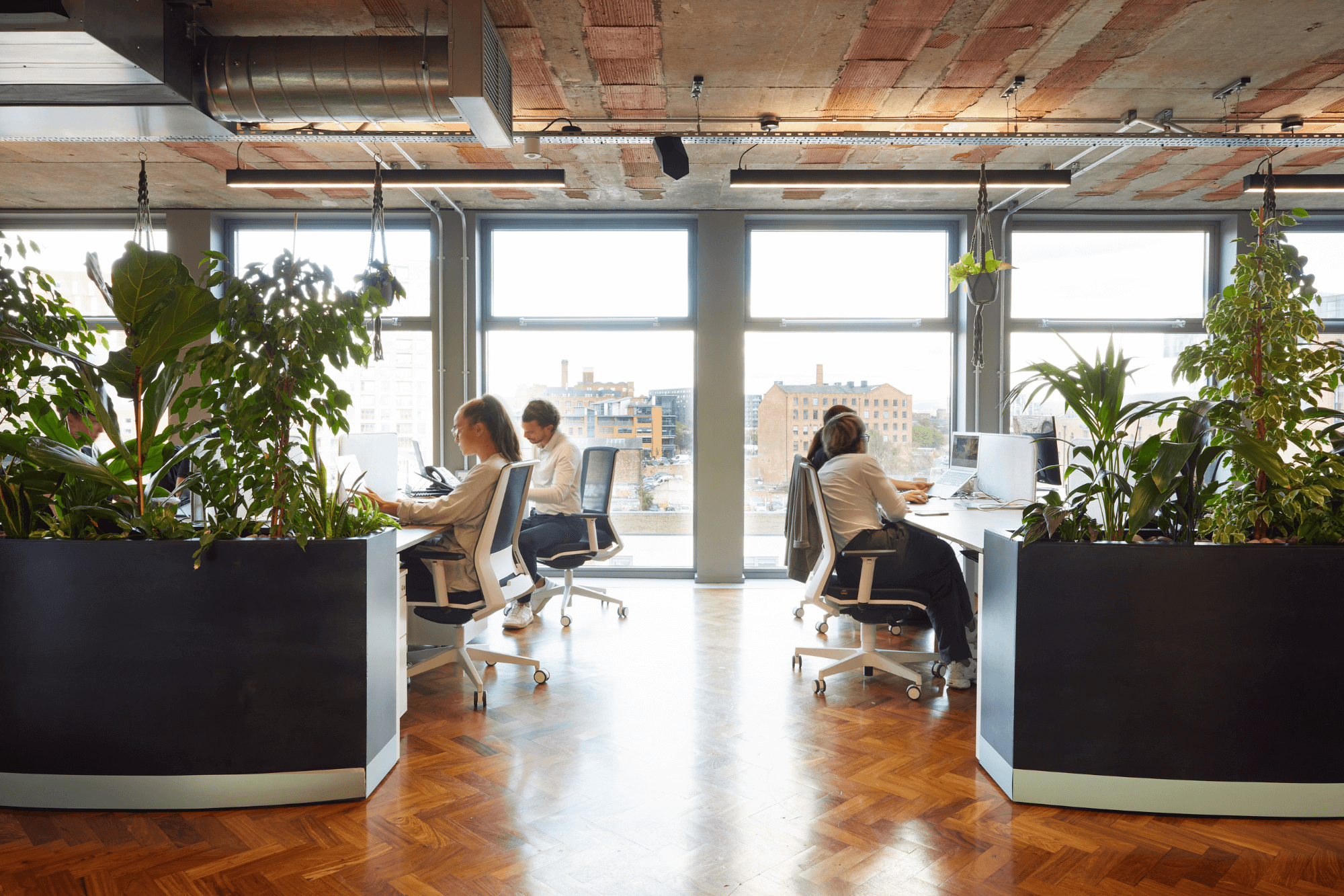 4th floor office at Hilton House showing two banks of desks and wooden parquet flooring with 4 people working