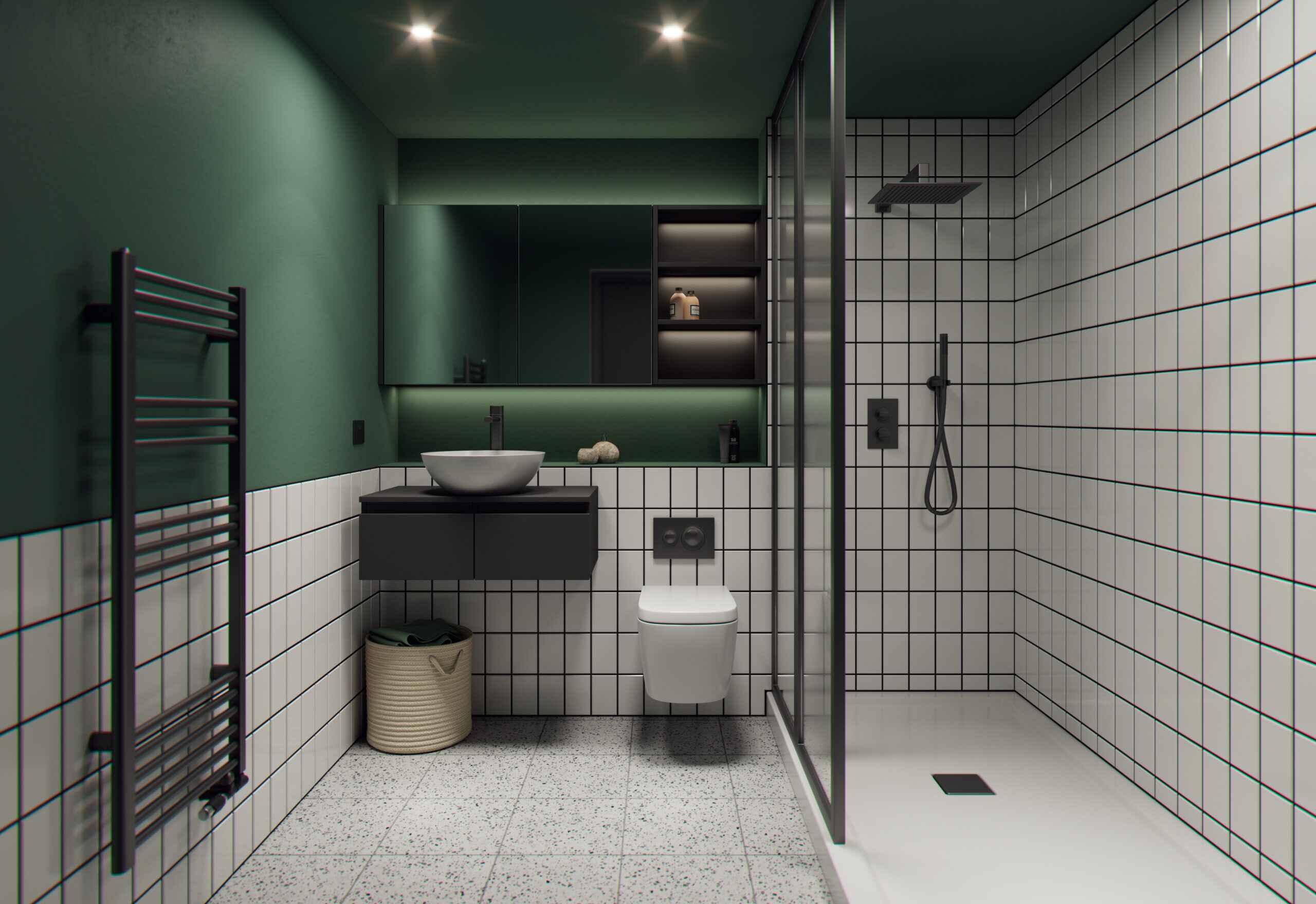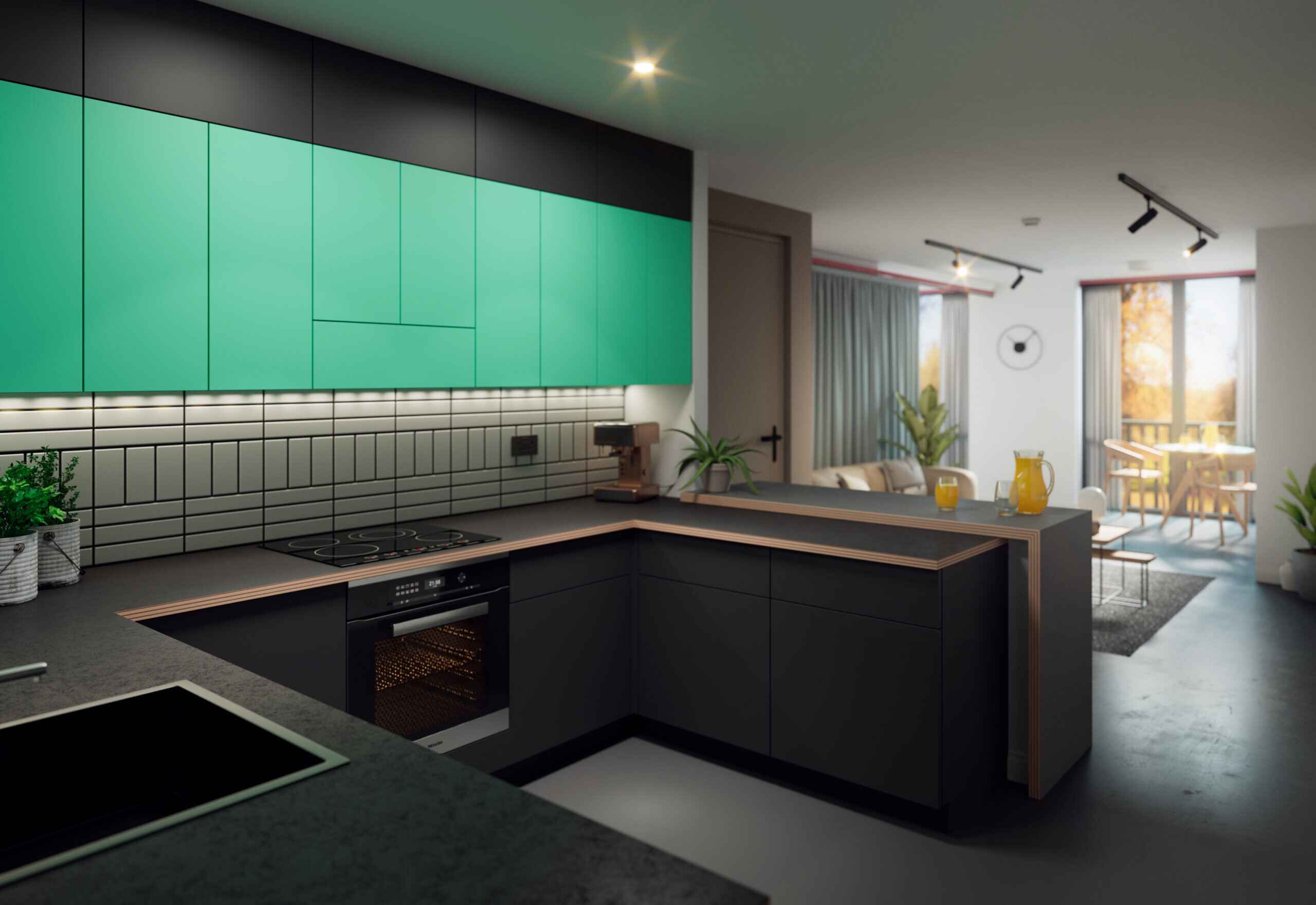 Every residence at Osborne Yard features a vast living-and-dining room that opens onto floor-to-ceiling windows & juliet or private balconies overlooking the city. The modernist interior creates an unpretentious, restrained and timeless space to live, demonstrating a harmony of finishes bringing together bespoke cabinetry and matt countertops in all spaces.